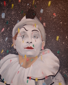 2006Het is een clown die vol bewondering naar confetti kijkt. Hij straalt rust en ontspanning uit, maar ook hoop en verlangen zijn merkbaar in zijn blik. NIET ingelijst